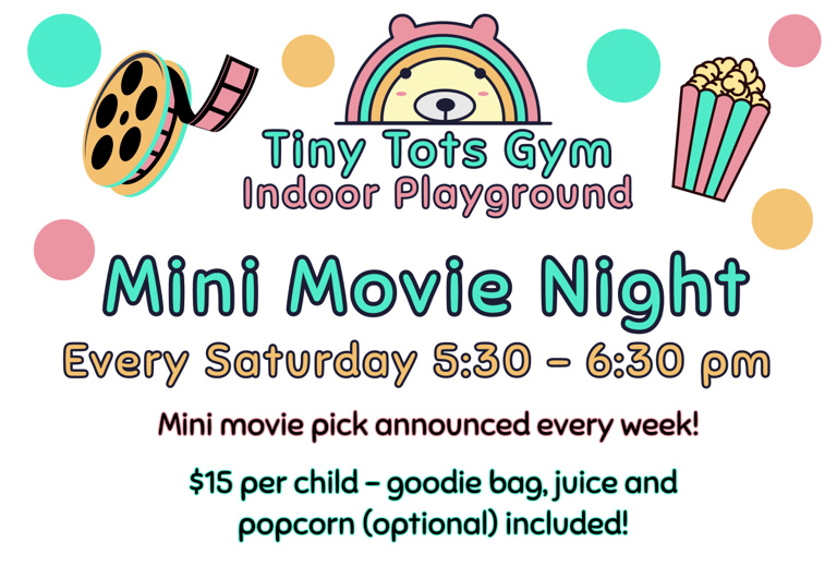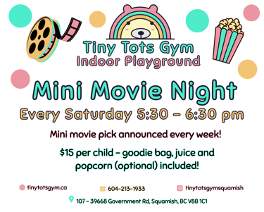 Join us every Saturday from 5:30 to 6:30 PM for Mini Movie Night at Tiny Tots Gym!