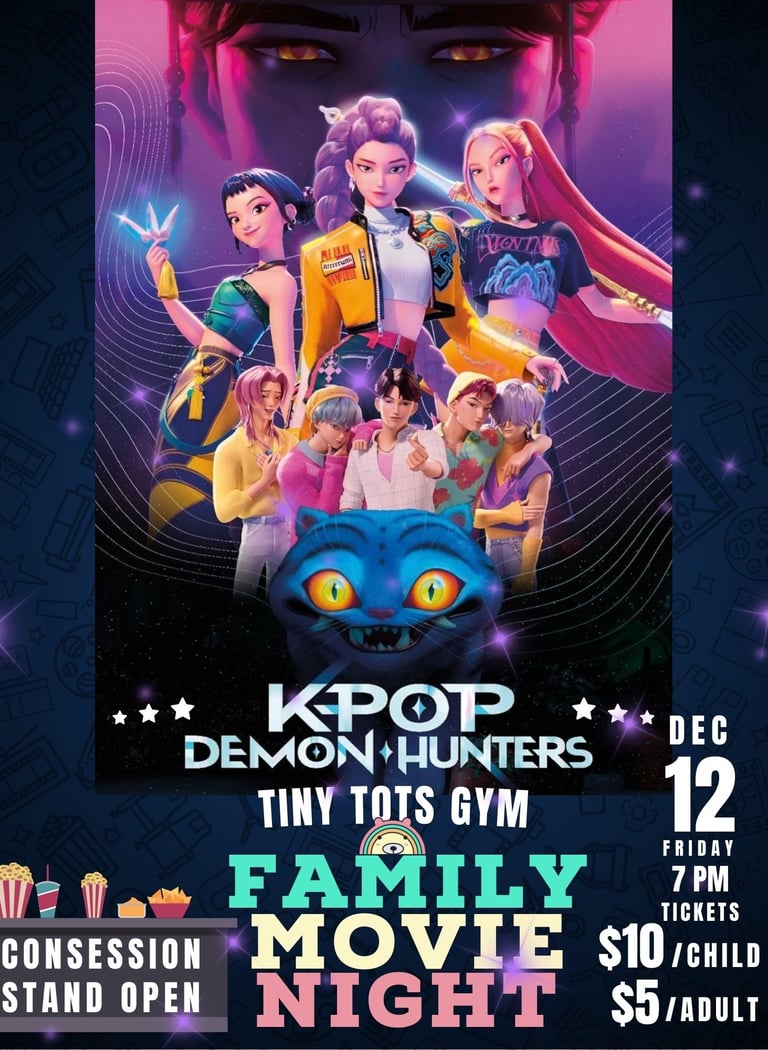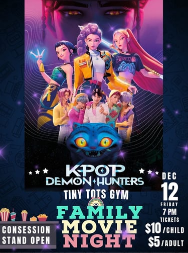 Book your tickets for our Family Movie Night ages 4 - 14! Concession stand open! Bring your own pillow and blanket! December 12, 2026 @ 7 pm!